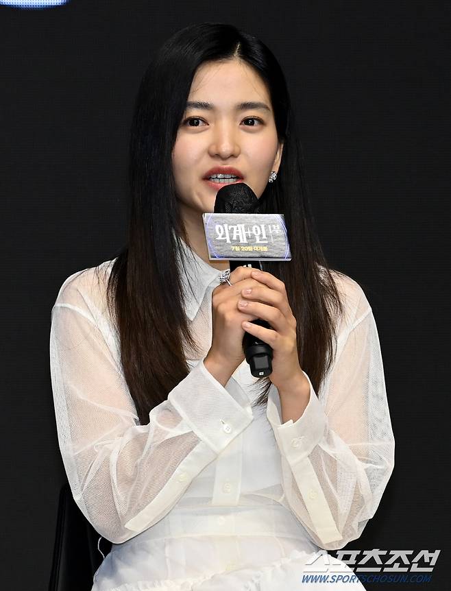 영화 '외계+인' 1부의 제작보고회가 23일 여의도 콘래드서울에서 열렸다. '외계+인' 1부는 고려 말 소문 속의 신검을 차지하려는 도사들과 2022년 인간의 몸 속에 수감된 외계인 죄수를 쫓는 이들 사이에 시간의 문이 열리며 펼쳐지는 이야기를 그린 영화다. 인사말을 하는 김태리의 모습. 허상욱 기자wook@sportschosun.com/2022.06.23/