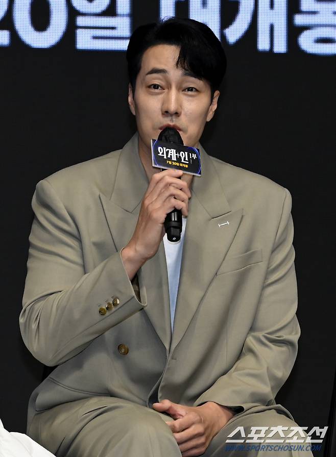 영화 '외계+인' 1부의 제작보고회가 23일 여의도 콘래드서울에서 열렸다. '외계+인' 1부는 고려 말 소문 속의 신검을 차지하려는 도사들과 2022년 인간의 몸 속에 수감된 외계인 죄수를 쫓는 이들 사이에 시간의 문이 열리며 펼쳐지는 이야기를 그린 영화다. 인사말을 하는 소지섭의 모습. 허상욱 기자wook@sportschosun.com/2022.06.23/