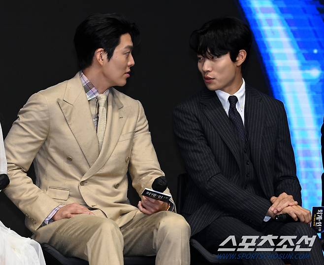 영화 '외계+인' 1부의 제작보고회가 23일 여의도 콘래드서울에서 열렸다. '외계+인' 1부는 고려 말 소문 속의 신검을 차지하려는 도사들과 2022년 인간의 몸 속에 수감된 외계인 죄수를 쫓는 이들 사이에 시간의 문이 열리며 펼쳐지는 이야기를 그린 영화다. 이야기를 나누는 김우빈과 류준열의 모습. 허상욱 기자wook@sportschosun.com/2022.06.23/