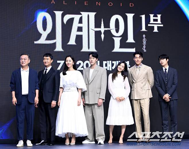 영화 '외계+인' 1부의 제작보고회가 23일 여의도 콘래드서울에서 열렸다. '외계+인' 1부는 고려 말 소문 속의 신검을 차지하려는 도사들과 2022년 인간의 몸 속에 수감된 외계인 죄수를 쫓는 이들 사이에 시간의 문이 열리며 펼쳐지는 이야기를 그린 영화다. 왼쪽부터 김의성 조우진 염정아 소지섭 김태리 김우빈 류준열이 포토타임을 갖고 있다. 허상욱 기자wook@sportschosun.com/2022.06.23/