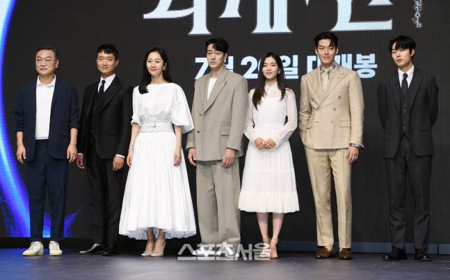23일 서울 영등포구 콘래드서울호텔에서 진행된 영화 ‘외계+인 1부’ 제작보고회에서 출연 배우들이 취재진을 향해 포즈를 취하고 있다. 왼쪽부터 김의성, 조우진, 염정아, 소지섭, 김태리, 김우빈, 류준열. 2022. 6. 23.