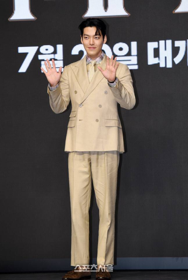 배우 김우빈이 23일 서울 영등포구 콘래드서울호텔에서 진행된 영화 ‘외계+인 1부’ 제작보고회에서 취재진을 향해 포즈를 취하고 있다. 2022. 6. 23.