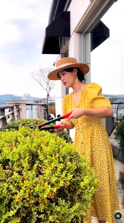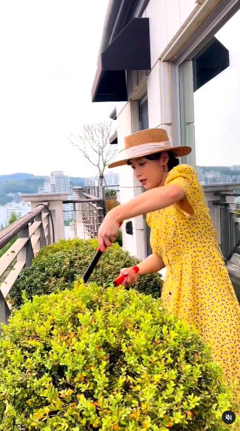 공개된 영상 속 기은세는 테라스에서 직접 나무의 가지를 치고 있는 모습.