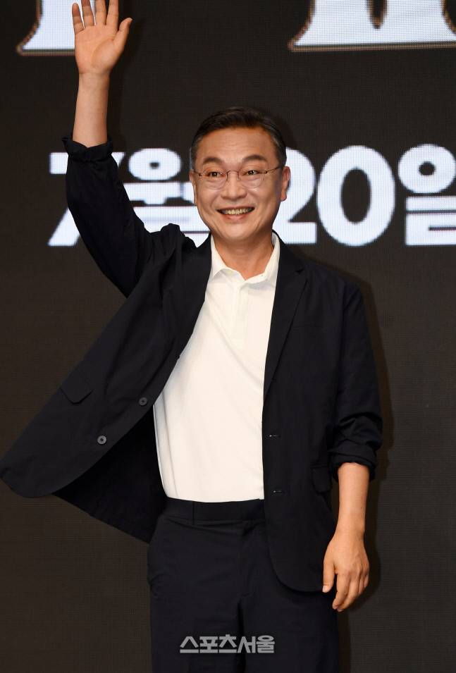 배우 김의성이 23일 서울 영등포구 콘래드서울호텔에서 진행된 영화 ‘외계+인 1부’ 제작보고회에서 취재진을 향해 포즈를 취하고 있다. 2022. 6. 23.