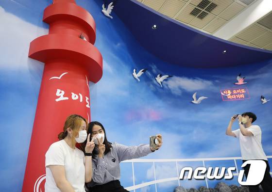 (서울=뉴스1) 송원영 기자 = 23일 서울 강남구 코엑스 A홀에서 열린 제37회 서울국제관광전에서 참석자들이 경기 시흥 오이도 바다거리 홍보 부스에서 기념 촬영을 있다.