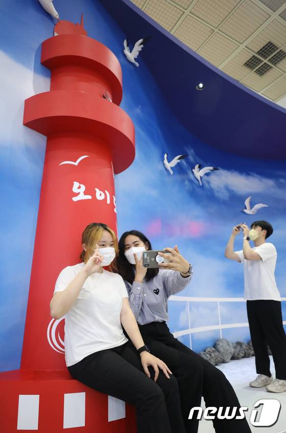 (서울=뉴스1) 송원영 기자 = 23일 서울 강남구 코엑스 A홀에서 열린 제37회 서울국제관광전에서 참석자들이 경기 시흥 오이도 바다거리 홍보 부스에서 기념 촬영을 있다.