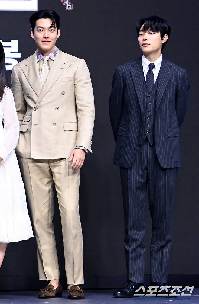 영화 '외계+인' 1부의 제작보고회가 23일 여의도 콘래드서울에서 열렸다. '외계+인' 1부는 고려 말 소문 속의 신검을 차지하려는 도사들과 2022년 인간의 몸 속에 수감된 외계인 죄수를 쫓는 이들 사이에 시간의 문이 열리며 펼쳐지는 이야기를 그린 영화다. 김우빈과 류준열이 포토타임을 갖고 있다. 허상욱 기자wook@sportschosun.com/2022.06.23/