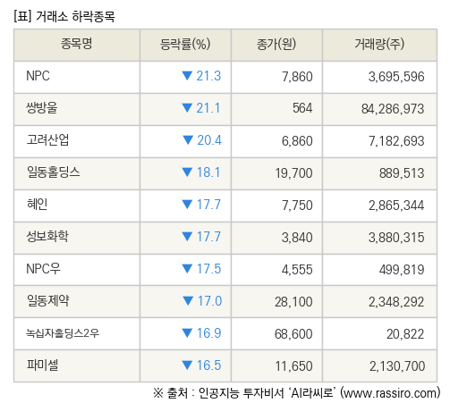 [fnRASSI]장마감, 거래소 하락 종목(NPC -21.3% ↓)