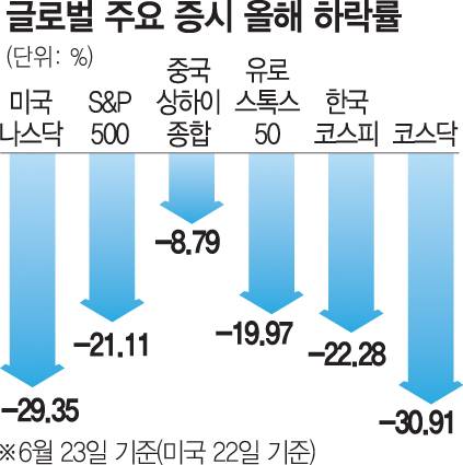 23일 한국거래소에 따르면 6월 1일 이후 코스피지수는 13.83%, 코스닥지수는 20.03% 떨어졌다. 올해 들어서는 코스피지수(-22.28%)와 코스닥지수(-30.91%) 모두 20% 넘게 주가가 빠졌다.