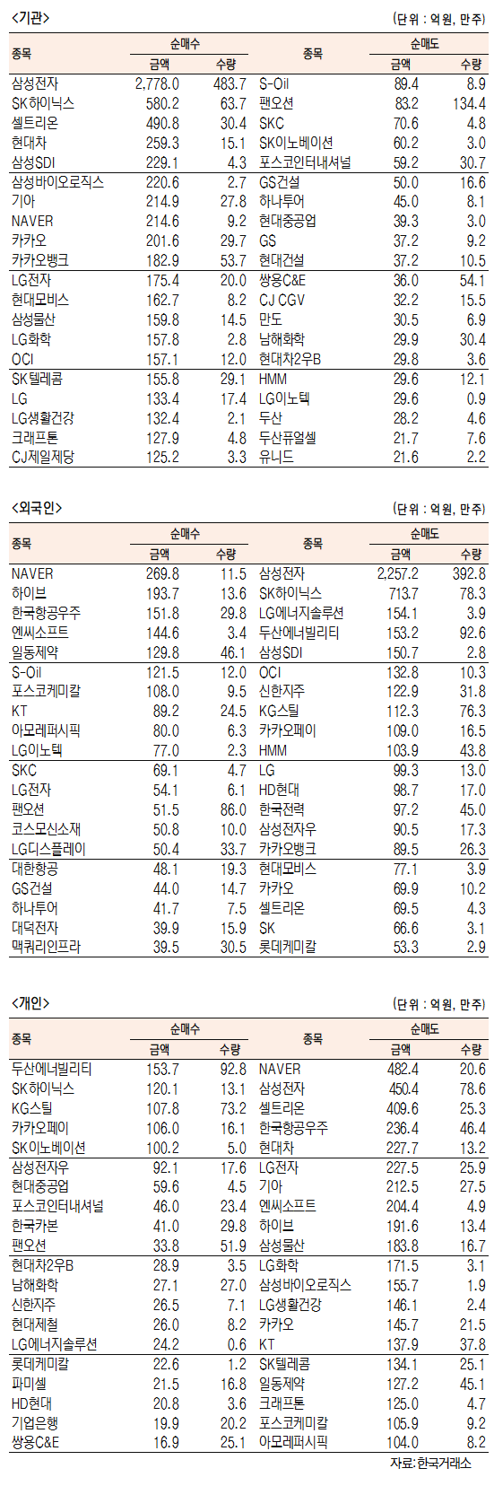 - [표]유가증권 기관·외국인·개인 순매수·순매도 상위종목(6월 21일-최종치)