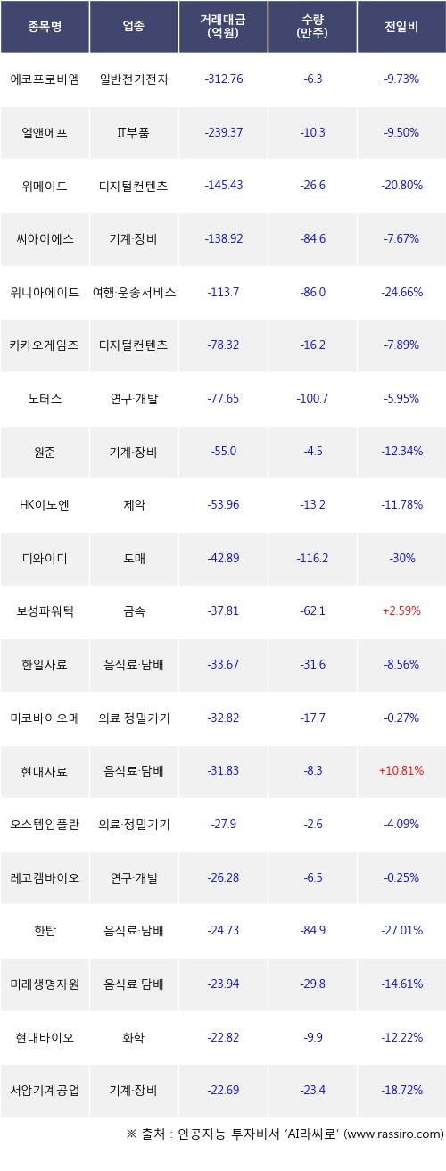 외국인 투자자의 순매도 상위 20개 종목은 에코프로비엠, 엘앤에프, 위메이드, 씨아이에스, 위니아에이드, 카카오게임즈, 노터스, 원준, HK이노엔, 디와이디등이다.