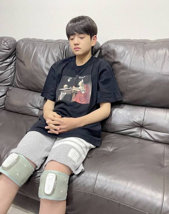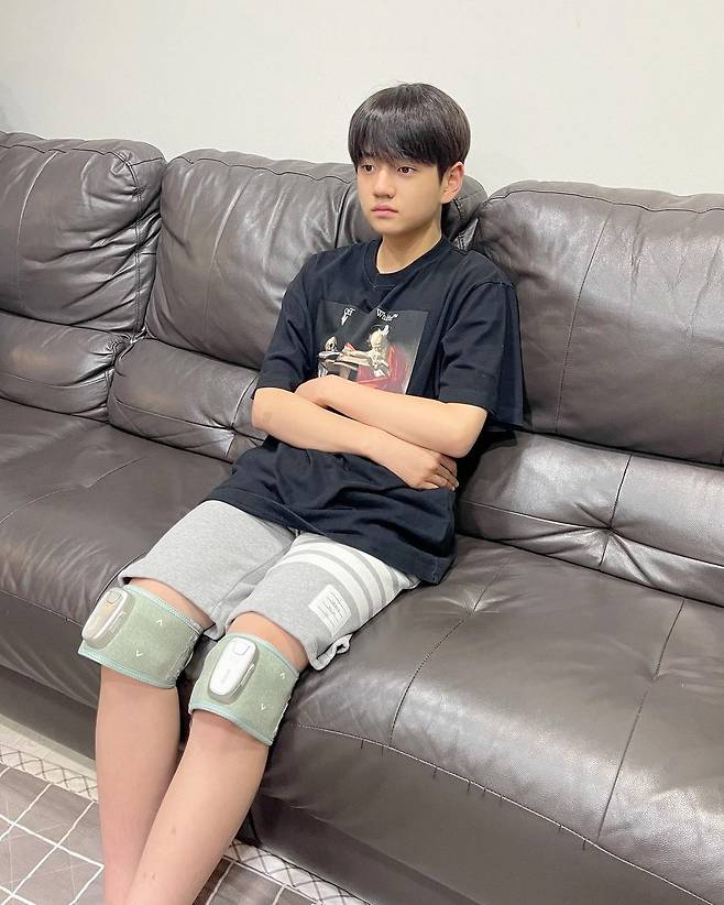 김강훈은 양 무릎에 성장판마사지기를 부착하고 멍하니 앉아있는 모습.