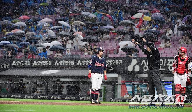 23일 광주 기아챔피언스필드에서 KBO리그 KIA와 롯데의 경기가 열렸다. 5회초 갑자기 내리는 많은 비로 인해 경기가 잠시 중단되고 있다. 경기를 중단시키고 있는 주심. 광주=송정헌 기자songs@sportschosun.com/2022.06.23/