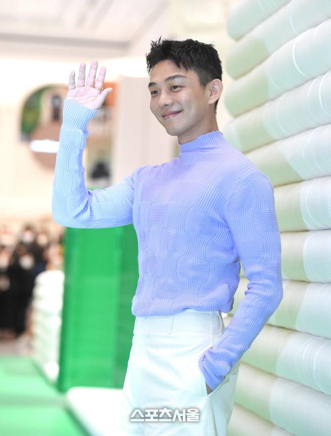 유아인이 23일 서울 신세계백화점 강남에서 열린 한 패션 브랜드 팝업스토어 오픈행사에 참석해 포즈를 취하고 있다.