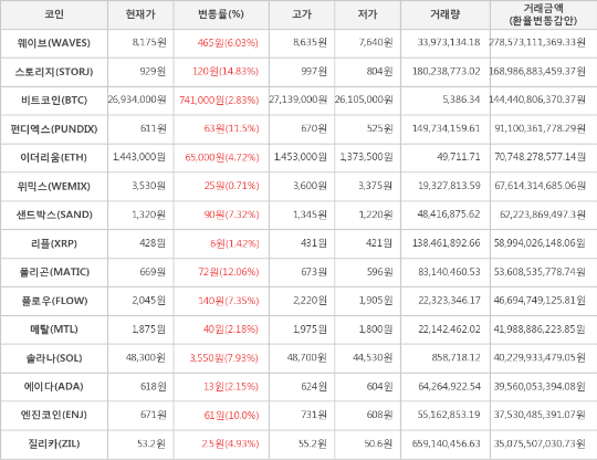 또한, 폴리곤(12.06%, 669원), 펀디엑스(11.5%, 611원), 엔진코인(10.0%, 671원), 솔라나(7.93%, 48,300원), 플로우(7.35%, 2,045원), 샌드박스(7.32%, 1,320원), 웨이브(6.03%, 8,175원), 질리카(4.93%, 53.2원), 이더리움(4.72%, 1,443,000원), 메탈(2.18%, 1,875원), 에이다(2.15%, 618원), 리플(1.42%, 428원), 위믹스(0.71%, 3,530원)가 상승세를 나타냈다.