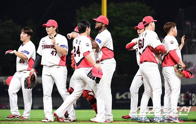 23일 광주 기아챔피언스필드에서 KBO리그 KIA와 롯데의 경기가 열렸다. KIA가 롯데에 승리하며 위닝시리즈를 달성했다. 경기 종료 후 승리의 기쁨을 나누고 있는 KIA 선수들. 광주=송정헌 기자songs@sportschosun.com/2022.06.23/