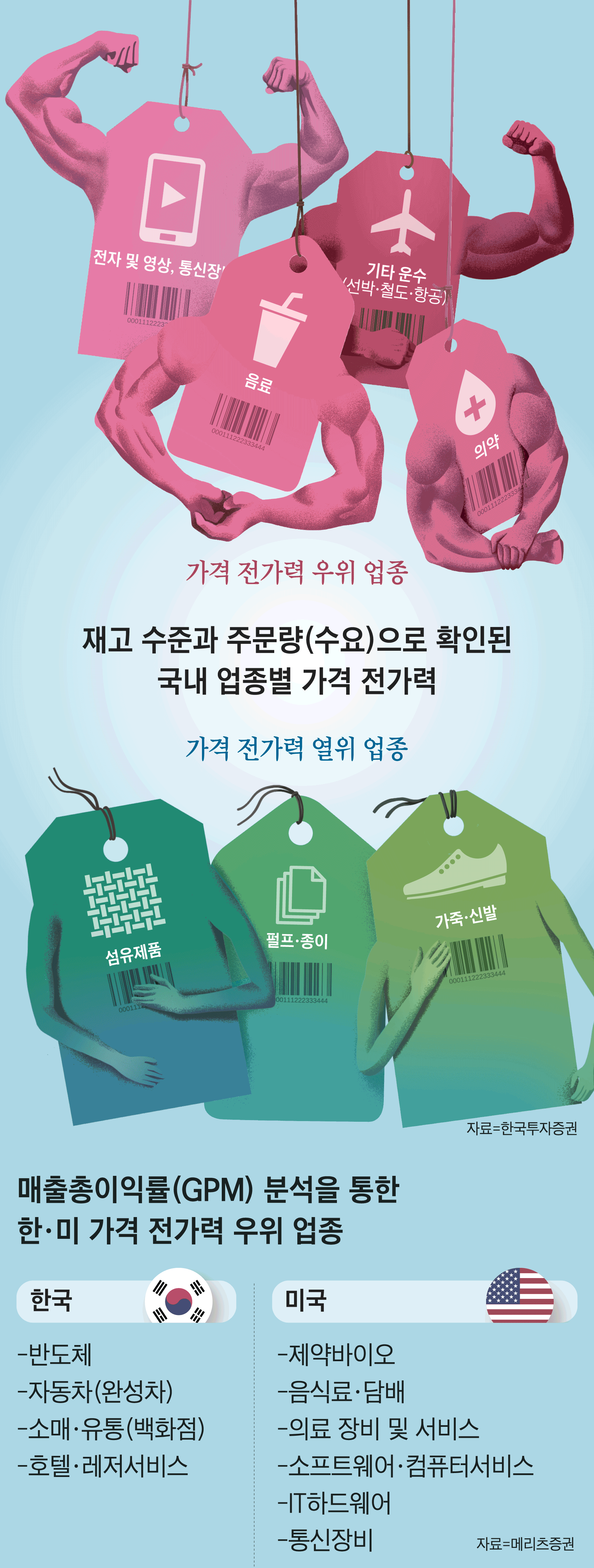 가격 전가력을 보유한 업종을 가려내는 데 널리 활용되는 지표는 매출총이익률(GPM)이다. GPM은 제조 및 서비스 원가를 제한 후 매출에서 얻을 수 있는 이익의 비율을 뜻한다. 원가가 빠르게 오르는데 가격 인상을 하지 못해 매출이 제자리 걸음을 한다면 GPM은 낮아진다. 반대로 가격을 인상하면 매출이 늘면서 GPM은 개선된다. 가격 전가력이 높은 업종은 고정 불변이 아니라 경제 상황과 공급망 사정 등에 따라 달라진다. 최근 메리츠증권이 미국 내 20여 세부 업종을 대상으로 GPM 수준 및 변동성(표준편차) 등을 분석한 결과, 제약바이오와 음식료·담배, 의료 장비·서비스, 소프트웨어·컴퓨터서비스, IT하드웨어 등의 가격 전가력이 특히 높은 것으로 나타났다. 반면 미디어, 약국·식료품점, 헬스케어 서비스 등은 전가력이 낮은 편이었다. 같은 기준으로 우리나라의 세부 업종을 분석했더니 반도체, 자동차, 백화점, 호텔·레저서비스 등이 비교적 수월하게 가격을 올릴 수 있는 업종으로 꼽혔다. 반대로 가격 전가력이 낮은 업종으로는 디스플레이, 철강, 기계, 비철·목재 등이 꼽혔다.