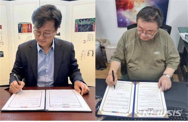 [서울=뉴시스]주벨기에유럽연합 한국문화원(원장 김재환·사진 왼쪽)이 경기문화재단(대표이사 강헌)과 한국 현대음악 공연 공동 개최에 대한 업무 협약을 체결했다고 23일 밝혔다. 오는 가을 브뤼셀에서 개최되는 이 공연은 한국 대중음악의 의미와 가치를 확산시키기 위한 취지로 기획됐다. 벨기에 문화원을 비롯하여 주프랑스 한국문화원(원장 전해웅), 주독일 한국문화원(원장 이봉기) 등도 함께 개최에 공동으로 참여한다. 이 공연은 오는 9월 브뤼셀을 시작으로 파리, 베를린 등에서 한국 대중음악 유럽 순회공연으로 펼쳐진다.2022.6.23.photo@news.com