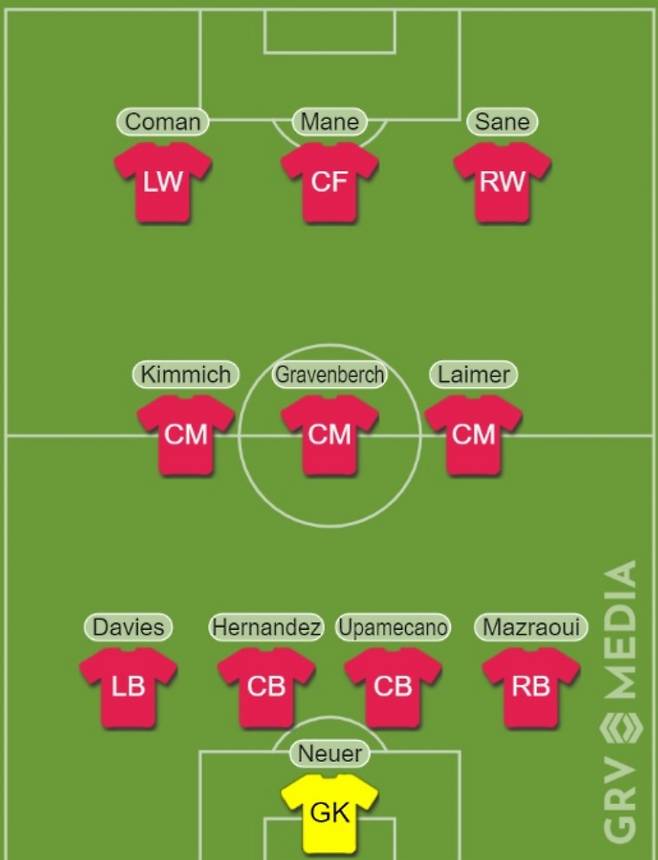 전방은 킹슬리 코망, 마네, 르로이 자네가 자리했다. 레반도프스키와 토마스 뮐러가 보이지 않는 것이 눈에 띄었다. 유럽축구연맹(UEFA) 챔피언스리그의 실패를 다시 반복하지 않기 위해 많은 선수를 교체했다.