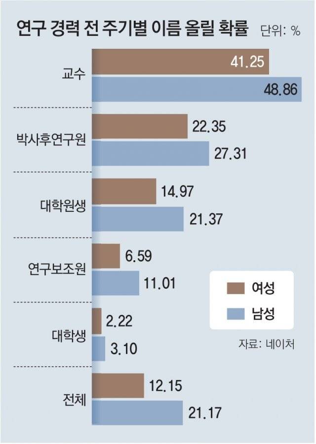 남성이 연구 기간 전체에서 논문 저자나 발명가로 이름을 올릴 확률은 21%로 나타났다. 반면 여성은 12%에 머무는 것으로 분석됐다. 특히 논문 게재일을 기준으로 1년 내 연구팀에 합류한 남성과 여성을 비교했을 때 남성이 이름을 올릴 확률은 2배인 것으로 나타났다.