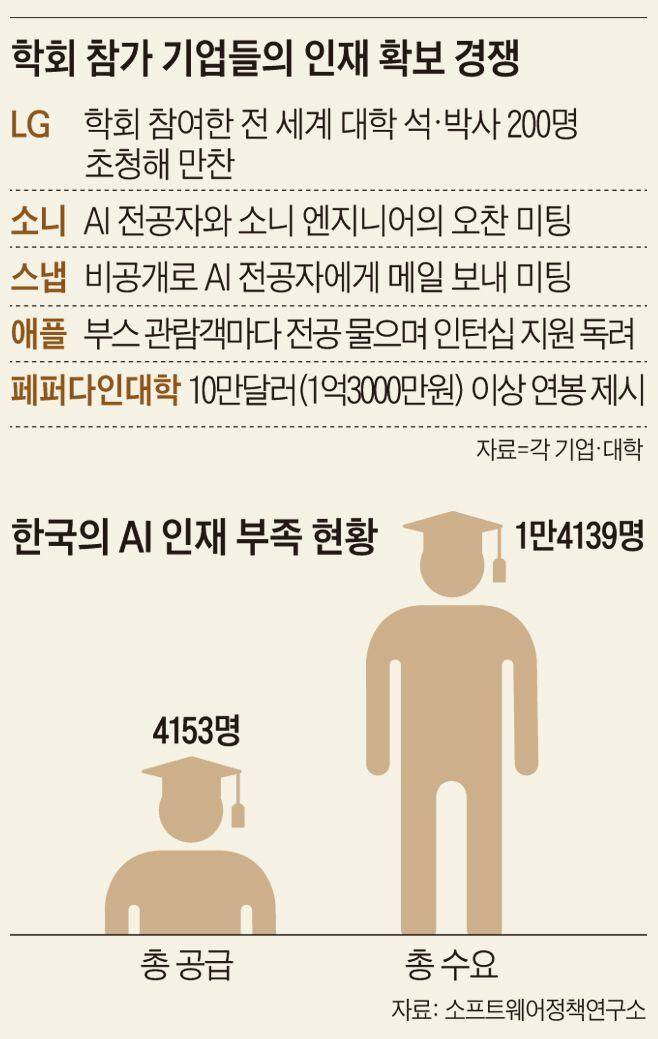 SNS 업체 스냅 등 해외 기업들은 학생들에게 직접 메일을 보내 비공개 미팅을 가졌다. 한 서울대 박사과정 학생은 “해외 기업들이 자신들과 비슷한 분야를 연구하는 학생을 미리 파악해 비공개 식사 자리에 초대하고 있다”며 “자기네 연구팀과 함께 연구 실적을 쌓으라고 권유하더라”고 했다.