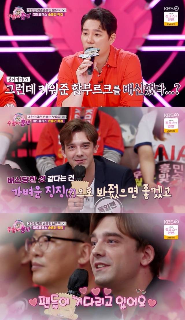 박미선은 “사랑한 만큼 실망이 컸다는 거다. 닉이 왜 저기 앉아있는지 알겠다”고 이해했고 닉은 “배신당한 것 같다는 이야기는 가벼운 징징이고 선택은 충분히 이해하고 언젠가 코치라도 함부르크에 다시 왔으면 좋겠다. 팬들이 기다리고 있으니까 상처가 치유될 것 같다”고 손흥민 팬심도 고백했다. (사진=KBS 2TV ‘팬심자랑대회 주접이 풍년’ 캡처)