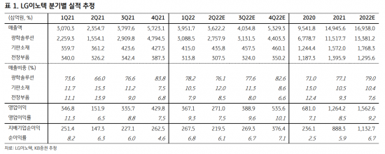 2분기 실적은 어닝서프라이즈를 기록할 것으로 보인다. 영업이익은 기존 추정치 대비 35% 상향한 2710억원으로 예상된다. 2분기가 LG이노텍의 연중 최대 비수기임에도 2분기 기준 사상 최대 실적 달성이 전망되는 이유는 인플레이션 소비패턴 양극화에 따른 아이폰13의 초고가 모델 판매가 예상을 상회하고 있기 때문이다.