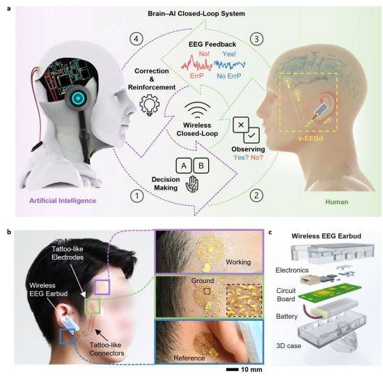 연구팀은 머리카락 굵기의 100분의 1 수준인 약 1마이크로미터의 두께로 고품질의 뇌파 측정이 가능한 문신 전극을 제작한 후 여기에 이어버드(밀착 무선 이어폰)를 통합하여 무선 웨어러블 뇌파 측정 장치를 개발했다.