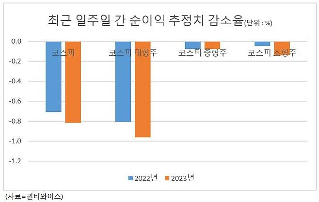24일 투자분석 프로그램 퀀티와이즈에 따르면 전날 기준 2022년 코스피 순이익은 일주일 새 0.7% 뒷걸음질쳤다. 2023년 순이익 전망치은 같은 기간 0.8% 떨어졌다.