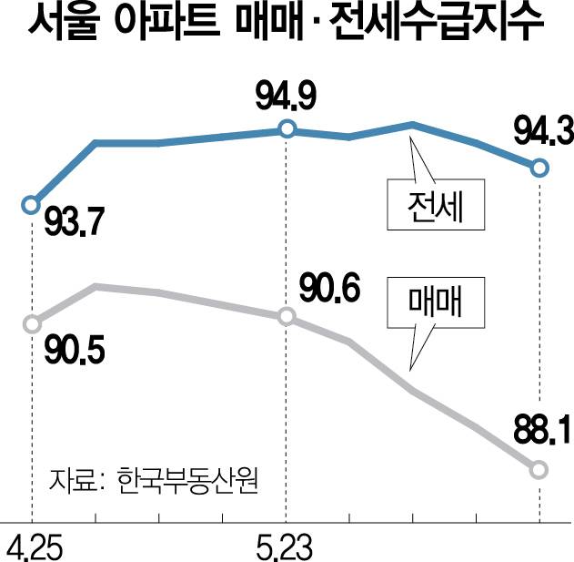 전세수급지수도 위축되며 서울 아파트 매매 가격과 전세 가격 모두 하락했다.