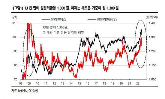시장에선 강달러를 이끈 요인이 인플레이션에 따른 미국 연방준비제도(Fed)의 '자이언트스텝(기준금리 0.75bp 인상)' 등 통화긴축에 따라 경기가 크게 위축될 수 있다는 '경기침체' 우려로 인해 안전자산으로 꼽히는 미국 달러로 투자금이 쏠린 것인 만큼 인플레이션이 진화되지 않을 경우 달러 강세가 계속될 것으로 내다봤다. 전규연 하나금융투자 연구원은 "미국 달러의 방향성은 결국 인플레이션과 미국 연준의 긴축 기조에 연동될텐데, 원자재 가격이 최근까지 가파른 상승세를 시현했다는 점에서 인플레이션의 피크아웃 시점은 다소 지연될 공산이 크다"며 "와 쏠림 현상을 감안해 하반기 달러-원 환율 상단은1,350원까지 열어둘 필요가 있어 보인다"고 했다. 안영진 SK증권 연구원은 "달러인덱스는 1980년대 중반 80대에서 현재 100대 중반까지 25%나 상승했다"며 "이같은 관점에서 원달러 환율 1300원은 비성적인 수준이 아니며, 결코 일시작으로 머물다 내려갈 수준은 아니다"고 전했다.