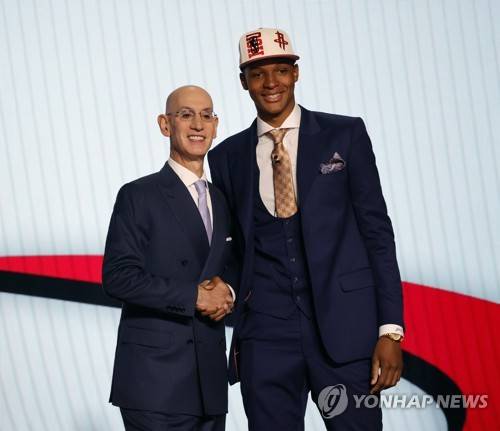 epa10030965 Jabari Smith Jr. from Auburn University (R), shakes hands with NBA Commissioner Adam Silver (L), after he was picked number #3 by the Houston Rockets during the 2022 NBA Draft at Barclays Center in the Brooklyn borough of New York, New York, USA, 23 July 2022. EPA/JASON SZENES SHUTTERSTOCK OUT