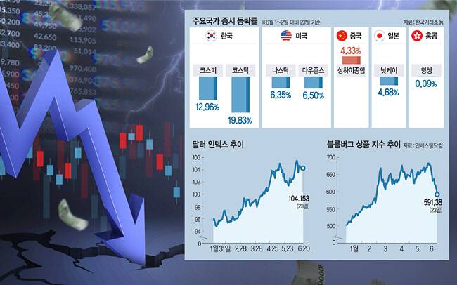 한국거래소에 따르면 올해 들어 코스피(22.28%)와 코스닥(30.91%) 모두 20% 넘게 주가가 빠진 것으로 드러났다. 문남중 대신증권 글로벌전략팀장은 “뉴욕증시는 현지시간으로 다음 달 13일 6월 소비자물가지수(CPI)가 발표될 때까지 보합세가 이어질 것으로 보이지만, 국내 증시는 반대매매가 급증하는 상황이라 해당 물량이 시장에 쏟아지면서 국내 증시가 받는 하방 압력은 더욱 커질 것”이라고 전망했다. 김정식 연세대 경제학부 명예교수는 “국내 증시의 외국인 투자자 비중이 31%로 다른 나라에 비해 상당히 높은데, 원유 가격 급등으로 한국의 무역수지 적자가 더 악화될 것으로 우려하는 외국인 투자자금이 금리가 대폭 인상될 미국으로 빠져나가고 있다”고 분석했다.