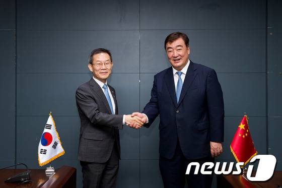 (서울=뉴스1) = 이종호 과학기술정보통신부 장관(왼쪽)이 24일 오전 서울 중구 서울중앙우체국에서 싱하이밍 주한중국대사와 면담 후 악수하고 있다. (과학기술정보통신부 제공) 2022.6.24/뉴스1