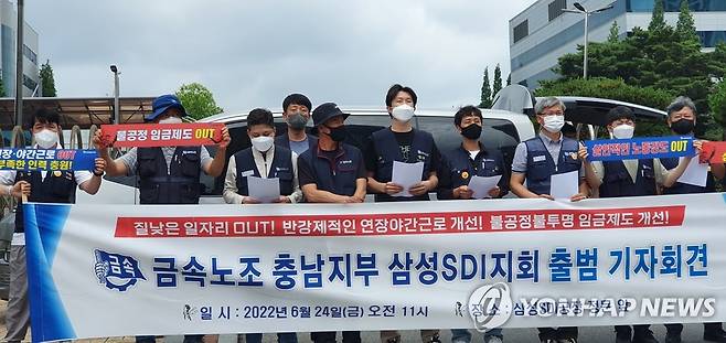 (천안=연합뉴스) 이은중 기자 = 전국민주노동조합총연맹(민주노총) 금속노조 충남지부가 24일 삼성SDI 천안사업장 앞에서 천안지회 노조설립 출범식을 열고 있다. 2022. 6. 24