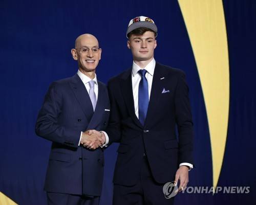 epa10031168 Christian Braun of the University of Kansas (R) shakes hands with NBA Commissioner Adam Silver (L) after he was picked number twenty-one by the Denver Nuggets during the 2022 NBA Draft at the Barclays Center in Brooklyn, New York, USA, 23 June 2022. EPA/JASON SZENES SHUTTERSTOCK OUT
