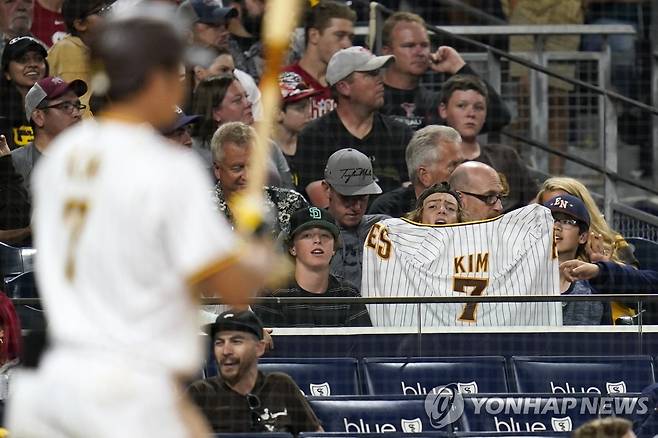 (샌디에이고 AP=연합뉴스) 23일(현지시간) 미국 캘리포니아주 샌디에이고 펫코 파크에서 열린 메이저리그(MLB) 샌디에이고 파드리스 대 필라델피아 필리스의 경기 8회에 샌디에이고 김하성(26)이 타석에 들어서자 한 팬이 그의 이름이 적힌 유니폼을 들고 응원하고 있다. 김하성은 3타수 1안타를 기록했으나 팀은 2-6으로 패했다. 2022.6.24