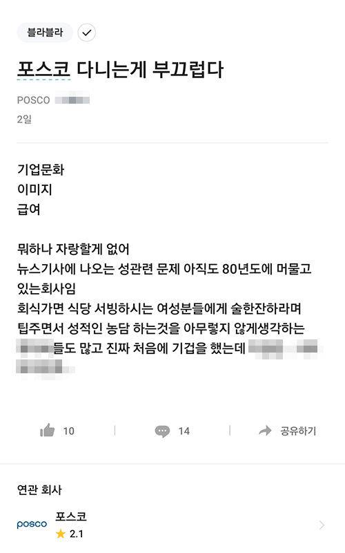 "성 관련 문제는 아직도 80년도에 머물고 있는 회사다. 성적인 농담을 아무렇지 않게 생각하는 사람들도 많다. 포스코 다니는 게 부끄럽다."
