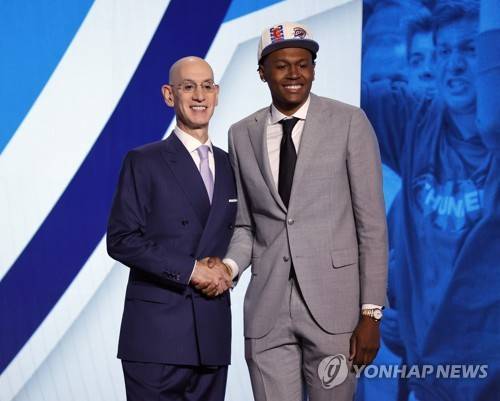 epa10031229 Peyton Watson of UCLA (R) shakes hands with NBA Commissioner Adam Silver (L) after he was picked number thirty by the Oklahoma City Thunder during the 2022 NBA Draft at the Barclays Center in Brooklyn, New York, USA, 23 June 2022. EPA/JASON SZENES SHUTTERSTOCK OUT