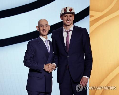 epa10031230 Nikola Jovic of Serbia University (R) shakes hands with NBA Commissioner Adam Silver (L) after he was picked number twenty-seven by the Miami Heat during the 2022 NBA Draft at the Barclays Center in Brooklyn, New York, USA, 23 June 2022. EPA/JASON SZENES SHUTTERSTOCK OUT