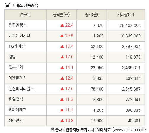 [fnRASSI]장마감, 거래소 상승 종목(일진홀딩스 22.4% ↑)