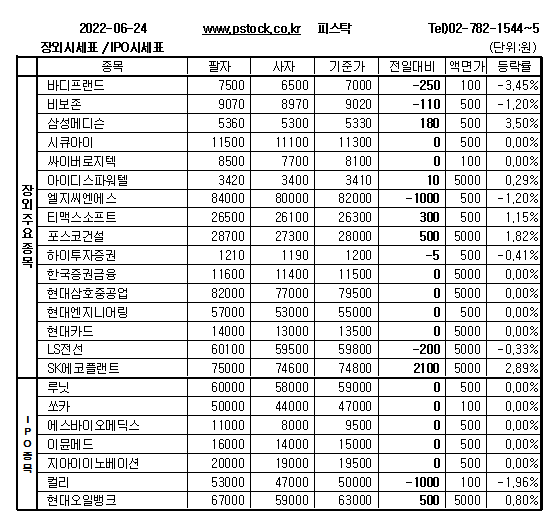 루닛(5만9000원), 싸이버로지텍(8100원), 한국증권금융(1만1500원), 현대삼호중공업(7만9500원), 현대카드(1만3500원), 디앤디파마텍(3만원), 쓰리디팩토리(7300원), 와이바이오로직스(1만7000원), 에이프로젠(1만6000원), 솔젠트(7500원) 등 장외종목은 주가변동없이 장을 마감했다.