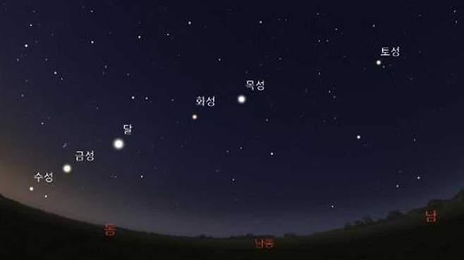 한국천문연구원에 따르면 한국에서 행성 정렬을 관측하기 가장 좋은 시기는 달이 그믐에 가깝고 수성의 고도가 3도 이상이 되는 26일 전후 오전 4시 30분(한국시간)쯤입니다.