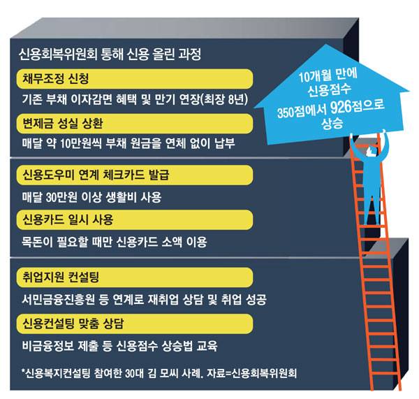 김씨는 신용도우미와 연계된 소액 체크카드를 발급받고 매달 30만원 이상 꾸준히 사용했다. 치아 교정으로 인해 목돈이 나갈 일이 생기자 김씨는 신용카드를 발급받아 소액으로만 사용했고 결제일에 신경 써 연체를 만들지 않았다. 김씨는 상담에서 신용평가사에 국민연금, 건강보험료 등 납부 이력을 제출해 신용점수를 올릴 수 있다는 것을 안내받았다. 목돈이 필요하면 금융사 일반대출 대신 신용회복위원회와 연계된 햇살론 등을 이용할 수 있다는 것도 알게 됐다. 취업지원 컨설팅도 받은 김씨는 지난 2월부터 배달 라이더로 근무하면서 남은 부채를 상환하고 있다. 김씨는 "신용복지컨설팅 덕분에 매달 월세, 통신비 등 고정 지출액을 연체 없이 관리하고 체크카드만 이용하면서 불필요한 지출을 줄여나간 것이 큰 도움이 됐다"고 말했다.