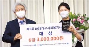 DGB금융(회장 김태오·왼쪽)은 타인을 위해 헌신하고 지역복지 발전에 이바지한 사회복지사를 대상으로 ‘제5회 DGB대구사회복지사상’을 수여했다. 윤보경 대구중구자원복지센터장이 대상을 받았으며, 총 8명이 수상했다. DGB금융은 2018년부터 어려운 상황 속에서도 소임을 헌신적으로 실천한 사회복지사를 선발해 상금과 상장을 수여하고 있다.