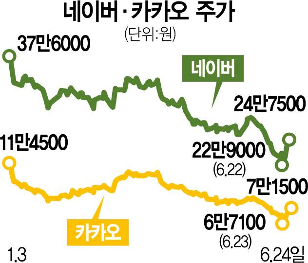 최근 급락장에서 낙폭이 두드러졌던 네이버와 카카오(035720)가 24일 5~6%대 반등에 성공했다. 그러나 연초 대비로는 여전히 30% 이상 떨어진 상태여서 저평가 매력이 있는 데다 정부의 플랫폼 규제 완화 의지가 상승세를 이어갈 모멘텀이 될 것이라는 전망이 나온다.