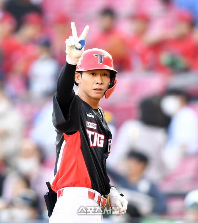 KIA 1번타자 박찬호가 24일 잠실구장에서 열린 2022프로야구 두산베어스와 KIA타이거즈의 경기 1회초 선두타자 안타로 출루하고 있다.2022.6.23.