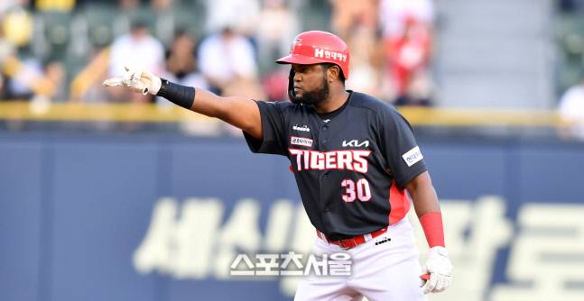 KIA 3번타자 소크라테스가 24일 잠실구장에서 열린 2022프로야구 두산베어스와 KIA타이거즈의 경기 2회초 2사 1,3루에서 1타점 2루타로 출루하고 있다. 2022.6.23.