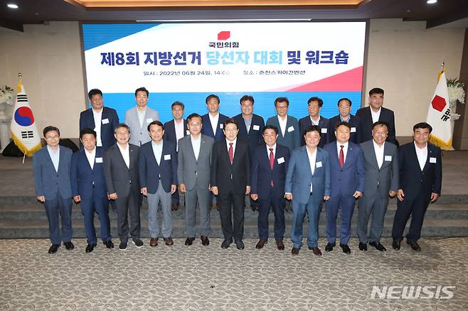 24일 오후 권성동 국민의힘 원내대표 등이 강원 춘천시 스카이컨벤션웨딩 2층 연회장에서 열린 국민의힘 제8회 지방선거 당선자 대회 및 워크숍에서 기념 사진을 촬영하고 있다.