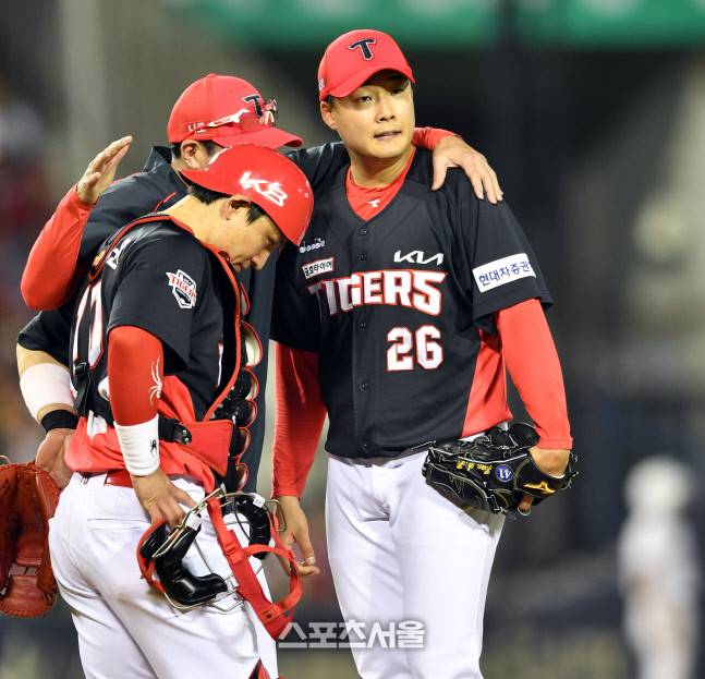 KIA 서재응 투수 코치가 24일 잠실구장에서 열린 2022프로야구 두산베어스와 KIA타이거즈의 경기 6회말 선두타자를 내보내자 마운드에 올라 한승혁을 다독이고 있다.2022.6.23.